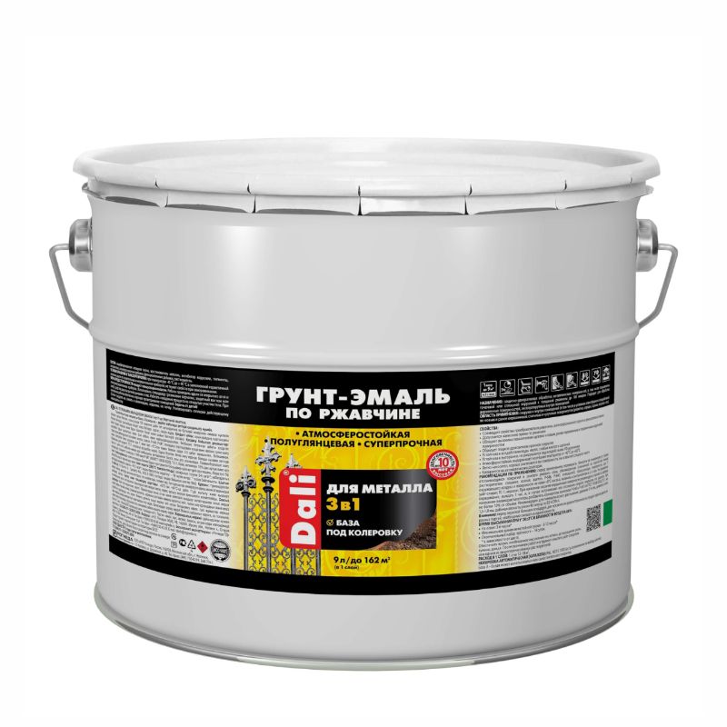 Грунт-эмаль DALI по ржавчине для металлических поверхностей. Применяется внутри и снаружи помещений по новым и ранее окрашенным стальным и чугунным поверхностям (решетки, ограды, гаражи, ворота и пр.), цветным металлам (цинк, медь, алюминий), поверхностям из оцинкованного металла и нержавеющей стали. Свойства: Краска совмещает свойства преобразователя ржавчины, антикоррозионного грунта и декоративной эмали. Допускает нанесение прямо на ржавчину, обладает высокими показателями адгезии к новым, а также ранее окрашенным и пораженным коррозией поверхностям. Эмаль образует идеально гладкое долговечное суперпрочное покрытие, устойчивое к воздействию воды, масел, слабых кислот и щелочей. Покрытие устойчиво к выгоранию, не разрушается под воздействием УФ-лучей, выдерживает сезонные колебания температур. Легко наносится на металл, хорошо растекается по поверхности, не оставляет следов от кисти, отличается высокими показателями укрывистости и низким расходом.