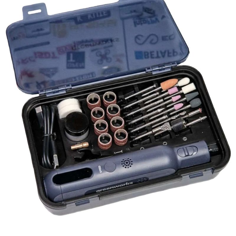 Гравер GREENWORKS — компактный инструмент для точных работ в домашних условиях, мастерской и сервисе. Модель поставляется с набором принадлежностей и двумя цангами, что позволяет выполнять разнообразные задачи. Инструмент подходит для резки, полировки, шлифовки, заточки, сверления и гравировки. Универсальность и удобство делают его надежным помощником для мелких и ювелирных работ.