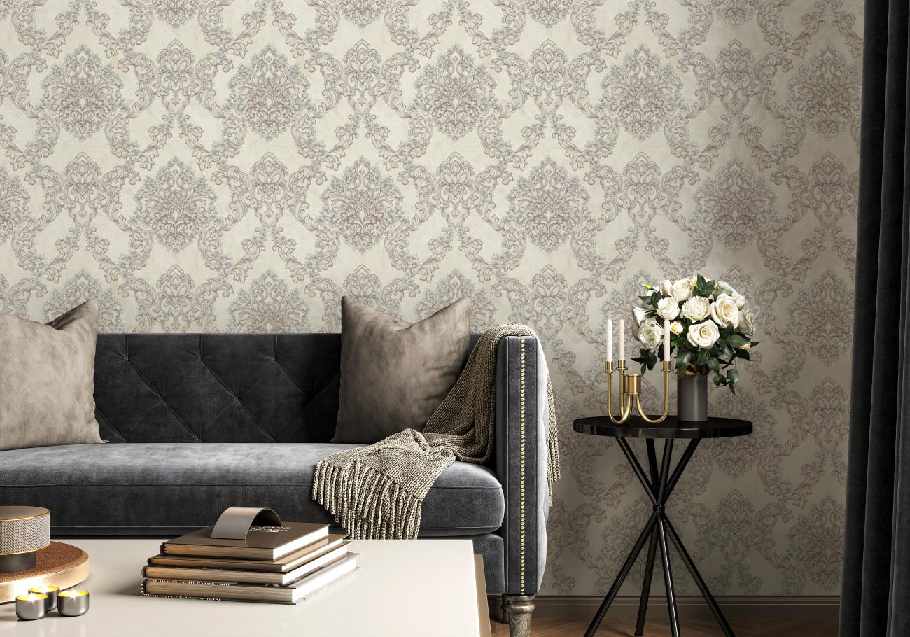Изысканный орнамент коллекции обоев Grafinya оживляет пространство, наполняя его величием эпохи аристократов. Мотив и фон объединяет структура шелковой тафты. Ее бархатистая поверхность приятна на ощупь. А сочетание матовых и перламутровых красок, которые красиво блестят на свету, создают эффект пышной драпировки ткани.