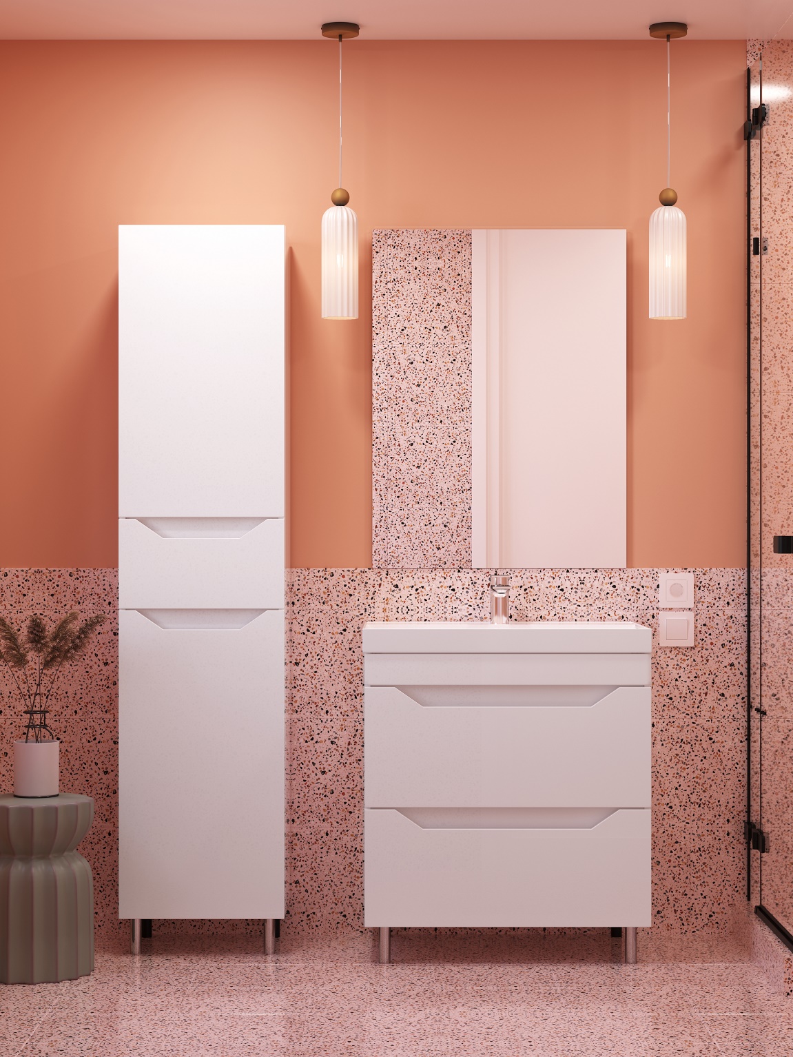 Фасады пенала глянцевые, из МДФ толщиной 16 мм в пленке ПВХ. Корпус из белого ЛДСП c кромкой ABS. У пенала 2 двери, 1 ящик. Внутри 4 полки для хранения. Пенал устанавливается на пол, опоры (10 см) регулируются по высоте. Поставляется в собранном виде.