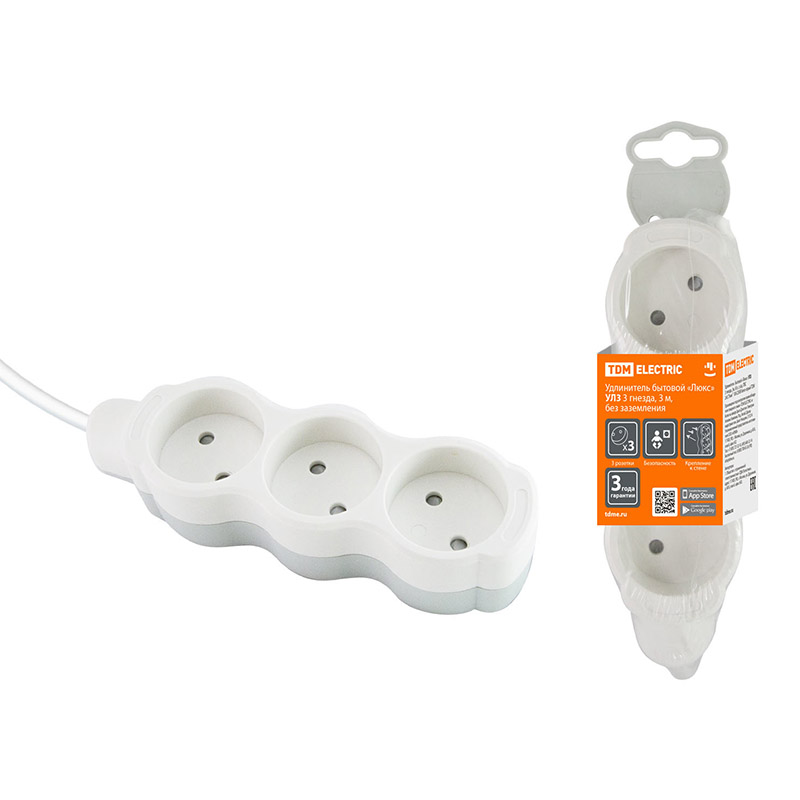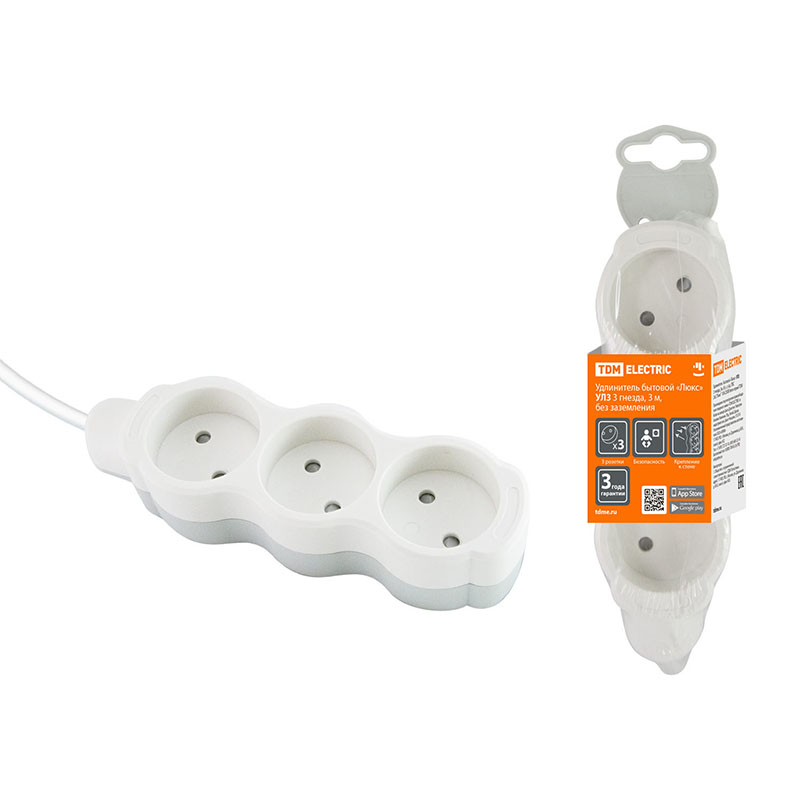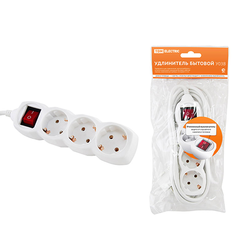 Удлинитель TDM 3 гнезда с заземлением с выключателем белый 3 м