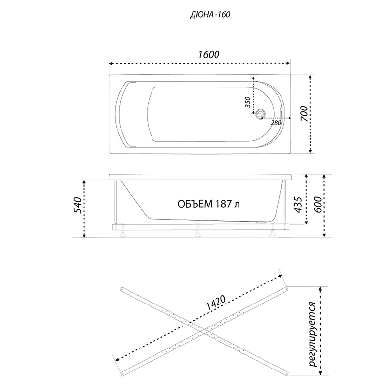 Ванна акриловая 1ACREAL Дюна 160*70 см